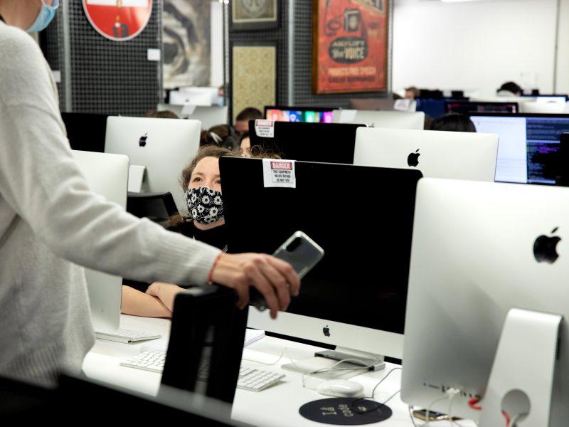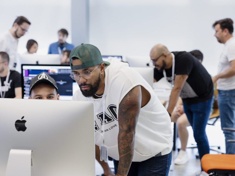 Small group of students working together on an iMac - School 21 campus (Russia)